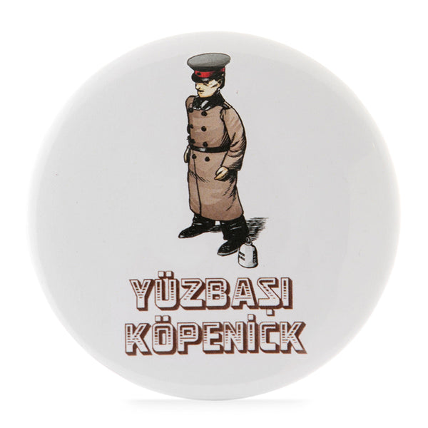 M.K. Perker’in İstanbul Oyuncak Müzesi’nde sergilenen “Yüzbaşı Köpenick” adlı oyuncağı çizgisine taşıdığı rozet.